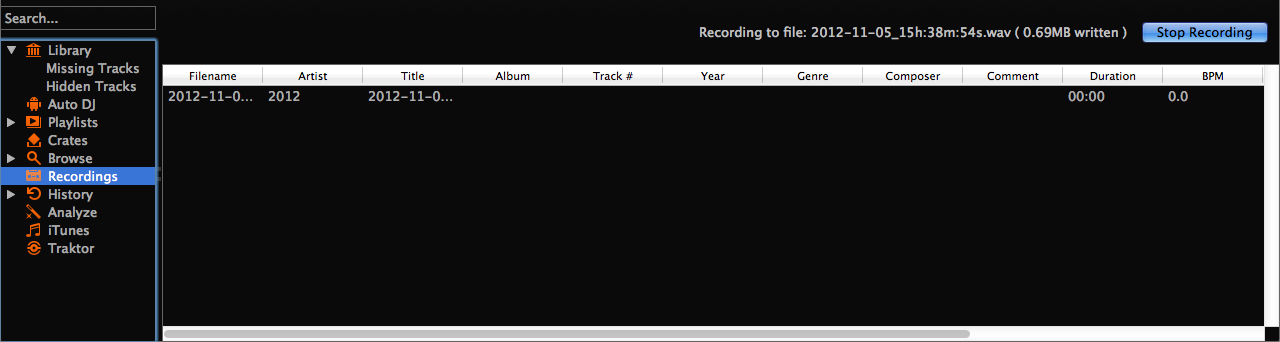 If you click on the Recordings icon in the sidebar of the Mixxx library, the track table to the right displays the content of your recordings directory. New recordings are automatically saved to this directory as well as CUE files if you choose to create them in the preferences.