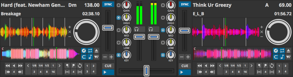 The big waveform summary shows the waveform envelope of the track near the current playback position and is updated in real time. The mouse can be used on the waveform to pause, scratch, spin-back or throw the tracks. Right-clicking on the waveforms allows you to drag with the mouse to make temporary pitch adjustments.