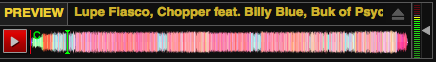 • Waveform overview: Shows the various markers (Cues, Hotcues) within the track as well as the waveform envelope of the entire track. Clicking somewhere on the waveform allows you to jump to an arbitrary position in the track.